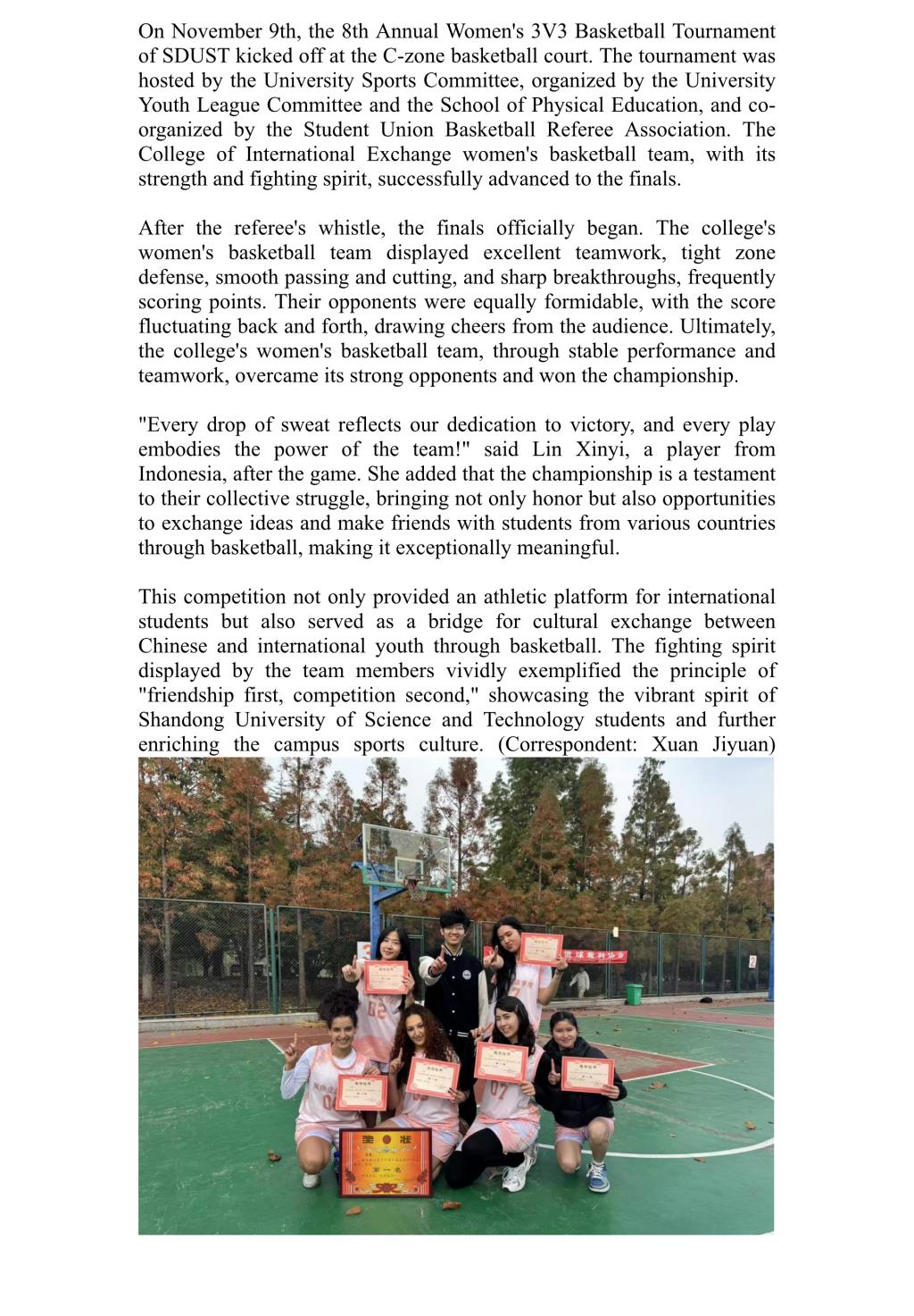 The College of International Exchange Wins the Championship in the 8th Annual Women's 3V3 Basketball Tournament at Shandong University of Science and Technology