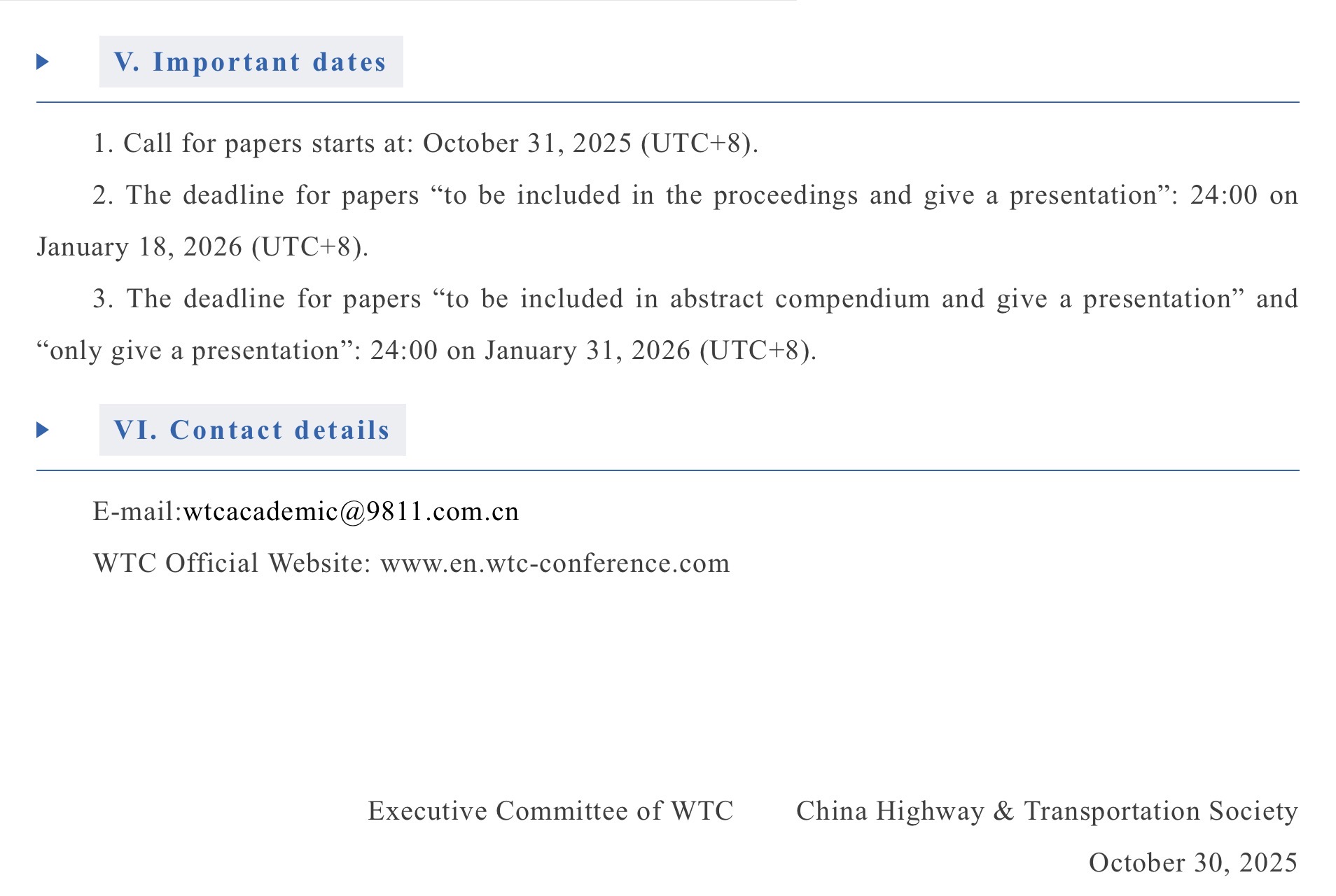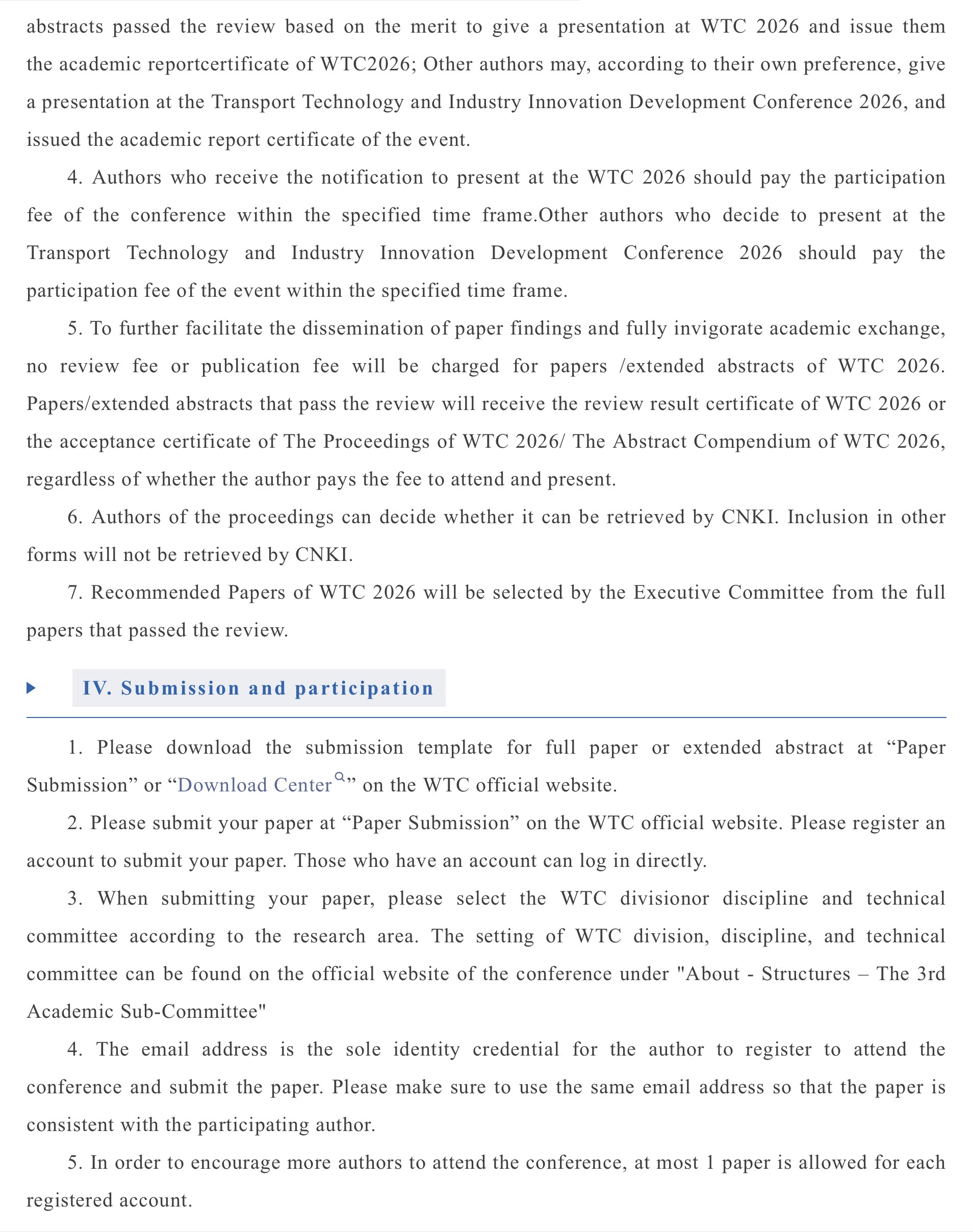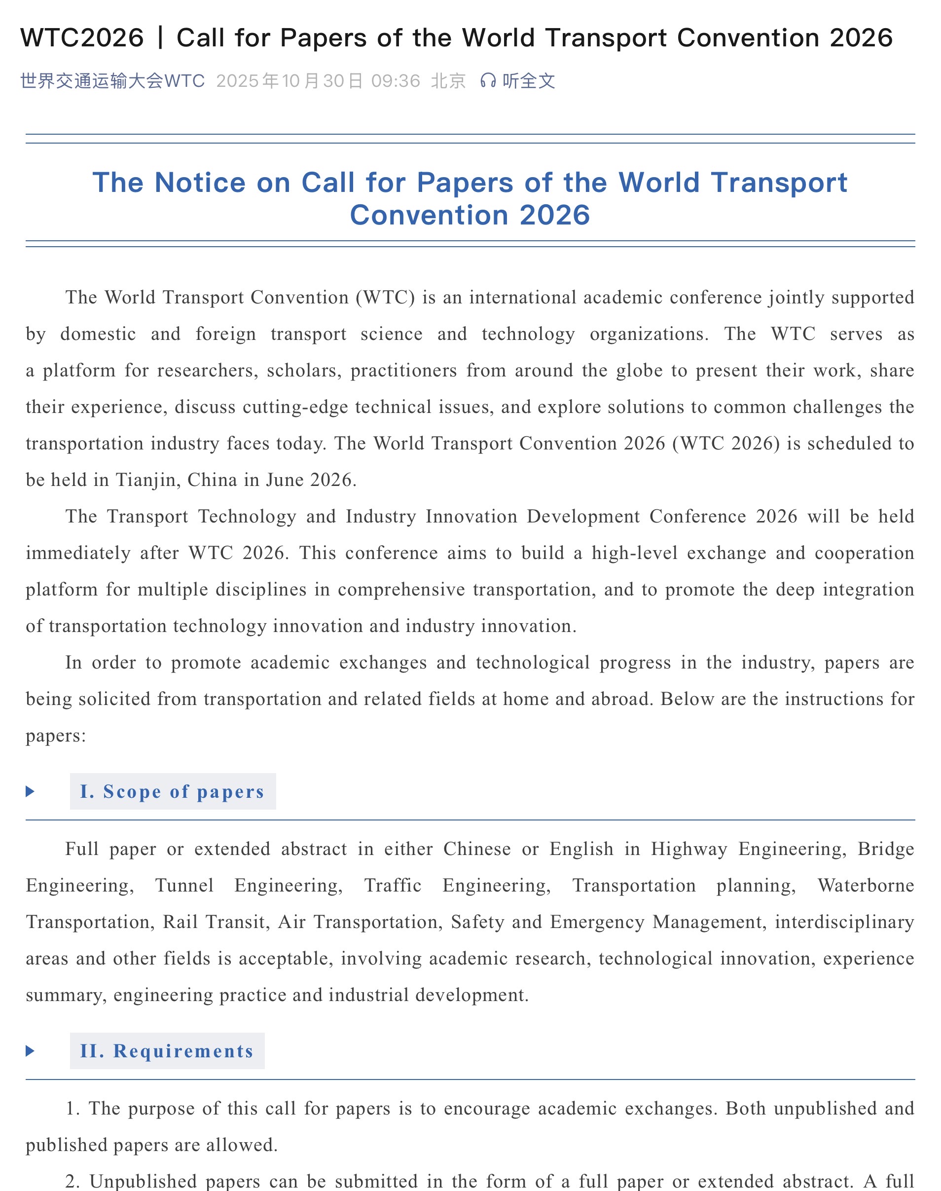 The Notice on Call for Papers of the World Transport Convention 2026