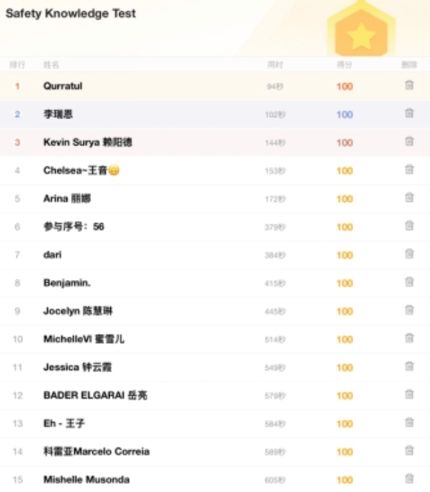 The online Safety Knowledge Test organized by the College of International Exchange has been successfully launched. This activity aimed to strengthen the safety awareness of international students and test their mastery of safety knowledge, and received active participation from international students of various countries. The ranking results of the test are hereby announced as follows: