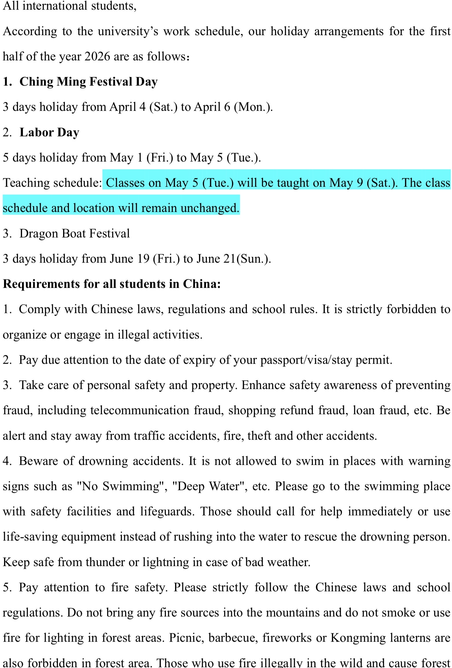 Holiday Arrangements for the First Half of the Year 2026